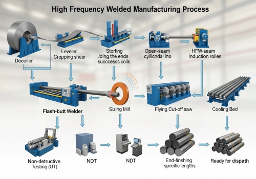 I want to take you deeper into the factory floor. When I walk through our Centerway Steel production base, the first thing I notice is the precision of the hfw pipe manufacturing process. It is not just about bending steel; it is about controlling energy. First, we start with Raw Material Preparation. We select high-grade steel coils. This is the foundation. If the coil has poor chemistry, the weld will fail. Next is Forming. We use a specialized forming machine that gradually bends the flat steel strip into a round pipe blank. This must be done gently to avoid stress on the metal. Then comes the most important part: High-Frequency Welding. Unlike older methods, we use a current (often exceeding 70 kHz or even 100 kHz depending on if we are following API 5L or EN 10217-2 standards) to heat the edges. We do not use any filler metal. The edges heat up instantly, and rollers squeeze them together. This extrusion forces impurities out and creates a solid forged bond. After welding, the pipe goes through Weld Seam Treatment. We remove the internal and external "flash" or beads to make the surface smooth. But we don't stop there. The welding heat changes the metal structure, so we perform Online Seam Annealing. We reheat the weld area to normalize the grain structure. This prevents the weld from being brittle. Finally, the pipe goes through Sizing and NDT (Non-Destructive Testing). We use ultrasonic or X-ray tests to look inside the weld. If there is a flaw, the machine marks it immediately. Here is a simple breakdown of the process and what we check at each stage: