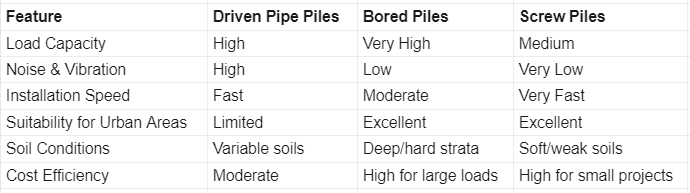 · Bored piles provide excellent performance in urban areas but require longer installation times.