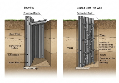 Cantilever Shoring: This is the simpler method. The sheet pile is driven deep into the ground. The earth holds the bottom, and the top stands free. It works like a diving board. This is good for shallow excavations. It relies on the pile's own strength to hold back the dirt. Braced Shoring: When you dig deeper, the pressure from the soil gets very high. A simple wall might bend or snap. In this case, we use bracing. We put steel beams or anchors inside the excavation to push against the wall. This gives it extra support. This is vital for deep foundations or when working near heavy traffic.