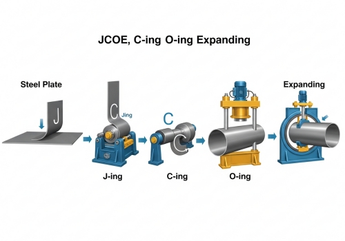 Чтобы действительно понять ценность этого продукта, нам нужно посмотреть, как мы формируем металл. Термин «JCOE» описывает процесс изгиба стальной пластины. Это не делается все за один раз. Сначала мы прижимаем пластину к форме «J». Затем снова нажимаем на нее, чтобы сделать форму «C». Наконец, мы прижимаем его к форме «O» перед сваркой. «Е» означает расширение, что я объясню позже. Этот метод отличается от технологии UOE. UOE быстрее, но очень дорог в настройке и менее гибок. В Китае мы предпочитаем JCOE, потому что мы можем быстро изменить размеры для вас. Если вам нужна труба с наружным диаметром (OD) 1400 мм сегодня и 900 мм завтра, JCOE легко справится с этим. Вот сравнение того, почему мы используем эту технологию: